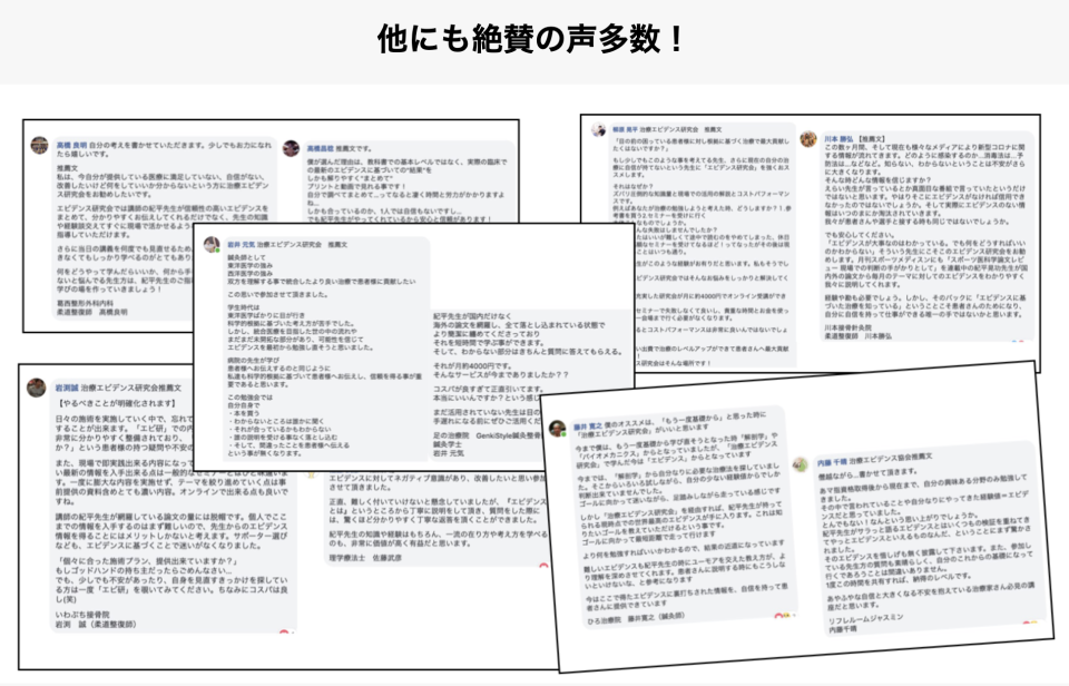 今では、もともとは会員としてエビ研を活用していた伊藤超短波専属セミナー講師でもある中井啓太先生が、「紀平先生の学びを毎月自分の院で実践して、治療効果がとても高まっているので、もし他の先生方のお役に立てるなら」ということで、実践編の講師にもなってくれました。あなたも、その価値を感じてくれて、患者さんのために活かしてくれたら、嬉しいです。私たちと一緒に、より深い患者さん貢献を果たし「下肢障害で悩むひとをゼロに近づける」という使命を果たしていきましょう!